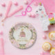 Pink and Gold Travel Themed Paper Plate Featuring Feminine Blush Pink Watercolor Flowers and Pretty Vintage Suitcases