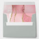 The inside of this elegant modern wedding invitation envelope features a blush pink watercolor agate design trimmed with faux gold glitter. Customize the back flap with the names of the bride and groom in white handwriting script and return address in copperplate font on a pale sage green background.