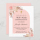 An arch frame decorated with rose gold and blush pink florals, roses and pampas grass. Personalize and add a name and details.