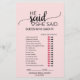 This blush pink calligraphy wedding word search game is perfect for an elegant bridal shower. The front of the game card features "he said she said" which is a fun quiz about the bride and groom. The back of the card features a word find with wedding related words and phrases. The design features a romantic and sweet flowing cursive font on a lovely and delicate light ballet pink background. Personalize the game card with the brides name and bridal shower date.