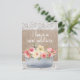 Rustic burlap and white lace change of address postcard with a metal flower pot full of beautiful blush and darker pink and cream-coloured watercolor flowers.