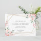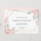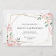 Customizable save the date card in clean white. Featuring pretty blush pink floral bouquets with a gold geometric frame.