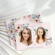 This trendy and elegant graduation party invitation features a soft blush pink background with two geometric shapes containing your own photos, and room for your class year and name. The invitation is also decorated with beautiful pink and peach watercolor roses and lots of green and blue leaves and foliage. The back of the card contains a matching watercolor wreath, and room for all of your party information for your guests.