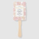 Pink and gold tropical leaves wedding program hand fan. It features leaves of Split Leaf Philodendron (Monstera deliciosa) or Swiss Cheese Plant and palm leaves in blush pink with gold outline . Your wording is in a white frame with gold outline.