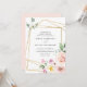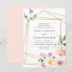 Elegant, floral wedding invitations featuring your wedding details surrounded by a faux gold foil geometric frame adorned with bouquets of blush pink, purple, and white watercolor flowers (peonies & roses) and lush green eucalyptus leaves. The feminine floral wedding invitations reverse to a light blush pink background.