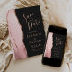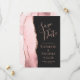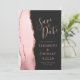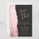 The left-hand edge of this elegant modern wedding save the date card features a blush pink watercolor agate border trimmed with faux rose gold glitter. The customizable text combines rose pink handwriting, copperplate and italic fonts on an off-black background. The reverse side repeats the blush agate design.