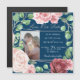 Elegant classy couple photo wedding save the date navy blue magnetic square card in a vintage romantic style featuring beautiful hand painted blush and burgundy roses with vivid green eucalyptus
