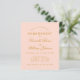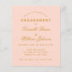 A simple engagement party invitation with a modern colour: blush pink. It has only golden text on blush background. The names are written in an elegant calligraphic script, the rest in caps. the first line is arched text.