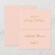 A simple blush pink wedding place card with the guest name and the table number printed on its front and the bride and groom names and the wedding date printed on the other side (that is the other half, before folding it). All text is golden calligraphic script.