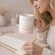 Feminine minimalist design on a white base, featuring blush ripple accents wrapping the lower portion and gold serif text near the rim reading “Bloom & Sip.” This piece fits morning coffee, desk breaks, or kitchen shelves where soft neutrals and clean detail define daily routines.