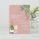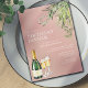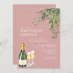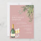 Fancy birthday dinner invitations featuring a watercolor illustration of a celebratory champagne bottle with two filled drink glasses. Text is fully editable. White text on a feminine blush pink background. (Background colours can be changed, if wanted, by using the design tool)