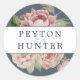 Chic floral wedding stickers are a perfect way to finish your invitation envelopes, favours and more. Designed to match our Blush Rose collection, round stickers feature a bouquet of watercolor rose and peony flowers in muted shades of blush pink and sage green on a brushed blue background, with your names in the centre.