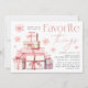 Invite friends to a Christmas or holiday themed favourite things party with this elegant and festive invitation, featuring watercolor illustrations in soft shades of blush pink. Your favourite things party details are flanked by a tower of wrapped Christmas gifts in blush pink watercolor, with cascading pink snowflakes. Personalize with your party details, including instructions for your guests on how many gifts to bring and their estimated value.