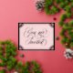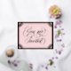 Blush pink rose gold foil postcard wedding invitation with You are invited in a swirly golden script inside an ornate gold foil frame. Add your wedding invitation wording on the other side. Rose gold and blush pink postcard wedding invitation with elegant rose gold foil details.