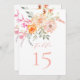 A simple and modern baby shower table number with a hand-painted watercolor bouquet, script lettering, and elegant typography. The card is decorated with a floral arrangement in the top left-hand corner. There are roses, dahlias, snapdragons, eucalyptus, and more. The sign reads "table" in flowing script and the custom number below. Please note that you will need to customize and order each table number separately. Part of our Baby in Bloom | Blush & Teal Spring Floral Baby Shower set - view the collection on this page, below the product image! Feel free to message me with any questions, I'll be happy to help!