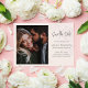 This design features a wedding save-the-date card with a modern minimalist, calligraphy script, and blush floral design, a simple photo template, and QR code website details.