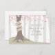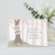 An outdoors wedding save the date featuring an illustration of a tree in the forest with pink leaves and exposed roots with a banner wrapped around the trunk for couple's names.