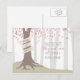 A wedding save the date postcard featuring an illustration of a tree in the forest. Tree has pink leaves, exposed roots, and a trunk wrapped with banner that can be customized with bride & groom's names.