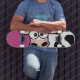 Blushing Cow Skateboard Deck. Design features an embarrassed black and white cow on a pink background. Perfect for girl skaters. Design © Lisa Marie Robinson