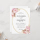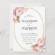 The wedding invitation displays a central oval framed by a double ring of golden lines, with clusters of pink peonies and their foliage adorning the top and bottom edges, creating an elegant floral arch on an off-white backdrop.