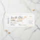 Boarding Pass Plane Ticket Save the Date Invitation Card with a small attached RSVP section for a Destination Wedding featuring a romantic airplane icon and faded gold world map background with modern elegant script fonts and back side with travel and accommodations information for guests to start planning their trip to celebrate your marriage in the middle of a vacation.