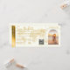 Boarding pass wedding ticket invitation featuring a elegant gold destination world map, compass, airplane, a personalized wedding invite template, and a rsvp section.