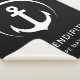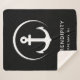 A modern nautical-themed personalized black sherpa blanket for your boat that features a white illustration of an anchor in a circle. Add your boat's name and location in simple white typography.