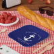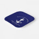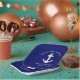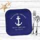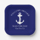 Modern nautical-themed paper plates for your boat that feature a white illustration of an anchor on a dark navy blue background. Personalize the "Welcome Aboard" text and your boat's name and location in elegant white typography.