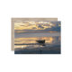 A lone Heron and an empty dinghy at low tide with the first golden rays of sunset reflected in the still pools of seawater left behind.