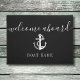 Elegant personalized welcome aboard mat featuring your boat or captain's name set in a classic white text on a black background. Designed by Thisisnotme©