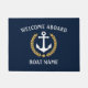 Personalize your home with a Welcome Aboard doormat and your boat name, family name or other desired text. Featuring a custom designed nautical boat anchor with a gold style laurel leaves and star emblem on dark navy blue or easily adjust the primary colour to match your current decor.