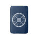 Bath mat featuring a white, elegant ship's wheel and rope emblem with custom boat name and hailing port (or other custom text) on a dark blue background.