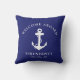 A chic modern nautical-themed outdoor pillow for your boat that features a white illustration of an anchor on a dark navy blue background. You can personalize the "Welcome Aboard" text and your boat's name and location.