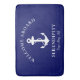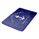 A chic modern nautical-themed bath mat for your boat that features a white illustration of an anchor on a navy blue background. You can personalize the "Welcome Aboard" text and monogram with your boat's name and location in elegant white typography.