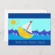 Digital illustration of a yellow boat on an ocean wave. The yacht has white sails and a red flag. The yellow sun shines down. Message reads 'Wish You Were Here!' Easily personalise this card by editing the template text. Thanks for viewing my designs.