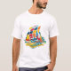 A colourful sailboat with a patchwork of vibrant geometric patterns glides through stylized, swirling waves. The composition features bold hues of red, blue, yellow, and orange, adding a lively and dynamic touch to the scene.