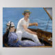 Boating (1874) by Édouard Manet is a stunning Impressionist painting depicting a man and woman leisurely sailing on a boat. The man, dressed in a casual white outfit with a straw hat, holds the tiller, while the woman, wearing a periwinkle blue dress, gazes across the shimmering blue water. Manet’s bold brushstrokes and striking colour contrasts create a sense of movement and tranquillity, capturing a fleeting moment of 19th-century leisure. This vintage artwork is perfect for collectors of fine art prints and antique reproductions.