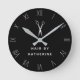 Round wall clock for a hair salon in black with roman numerals made by bobby pins. Add the name of your hair salon or hair styling business in modern letters beneath a pair of white scissors.