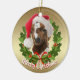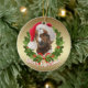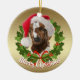 Adorable Baby Boer goat Custom painting by goatlady of GetYerGoat™ All decked out in his Santa Hat, Surrounded by a green Christmas wreath of Holly on a gold background on one side and Silver Bokeh background on the other side - Customize the Greeting that Says Merry Christmas on one side , customize the herd name, farm name or goat's name (OR ANY WORDING) as well as the year on the opposite side - Goat Christmas ornament for your Holiday gift giving, Christmas tree or window ornaments- double sided designs and can be personalized. Perfect for ornament swaps at Christmas Parties , Breeder gifts, veterinarian gifts, Show gifts.