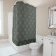 This shower curtain features a scallops fan pattern in earthy olive green, rust on navy blue for a bohemian look.