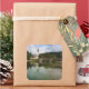 Photo sticker of a Bohinj lake landscape with calm water and reflection of St. John the Baptist church and the stone bridge in Ribcev Laz, Slovenia, at the start of autumn season.