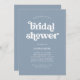 This simple and boho bridal shower invitation features white, retro typography on a dusty blue background.