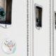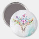 A magnet with a turquoise and pastel watercolor background. A boho chic animal skull with a floral bouquet upon its head and little butterflies fluttering about.