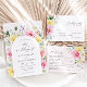 This wedding invitation features a beautiful floral and sage green botanical arch made of colourful flowers in pink, orange, blue, yellow, and white.