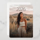 This stunning graduation design features a modern arched layout framing a warm, sunlit portrait set against a serene desert landscape. Soft golden tones, natural textures, and a glowing sky create a calm, earthy aesthetic that feels both timeless and on-trend. The bold “2026” at the top adds a striking focal point, while the graduate’s name and school are elegantly displayed below in clean, minimal typography. The combination of organic scenery and refined design creates a beautiful balance of modern style and natural charm, perfect for celebrating a graduation milestone in a unique and memorable way.