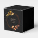 Set against a striking black background, this favour box features apricot-coloured text that provides a warm and inviting touch. Delicate leaves in soft muted earth tones and earthy autumnal copper shades evoke the cozy charm of autumn, while the geometric frame in burnt orange and terracotta adds a rustic yet sophisticated flair. This favour box perfectly complements your autumn-themed wedding, capturing the essence of a bohemian chic celebration. This favour box radiates warmth and elegance, reflecting the romantic and modern minimalism of your special day.