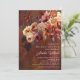 This boho autumn bridal shower invitation features a beautiful collage of cabbage roses, garden roses, ranunculus, berries, apples, and leaves. The invitation is set on a brown background with the date, time, and location of the bridal shower in a tasteful font. The bohemian design and autumnal colours add a touch of whimsy and romance, and the overall design is perfect for celebrating the upcoming bride with your loved ones in a stylish and festive way.
