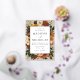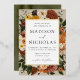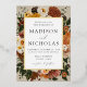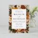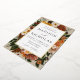 Elegant autumn wedding invitations featuring your wedding details inside of a thin gold foil frame with watercolor flowers and greenery in muted autumnal colours of ivory, orange, mustard gold, olive green, dusty rose, and brown. The fall floral wedding invitations reverse to display a rich olive green watercolor background. Designed to coordinate with our Boho Autumn Floral wedding collection.
