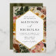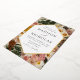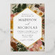 Elegant autumn wedding invitations featuring your wedding details nestled in a gold foil geometric frame surrounded by watercolor flowers and greenery in muted autumnal colours of ivory, orange, mustard gold, olive green, dusty rose, and brown. The fall floral wedding invitations reverse to display a rich olive green watercolor background. Designed to coordinate with our Boho Autumn Floral wedding collection.