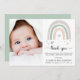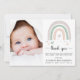Cute birth announcement and thank you card featuring a vertical photo of your newborn, a boho watercolor of a sage green, orange and lavender rainbow with hearts and "thank you" in a contemporary script with swashes. Add a personalized thank you message and your baby's name and birth stats.